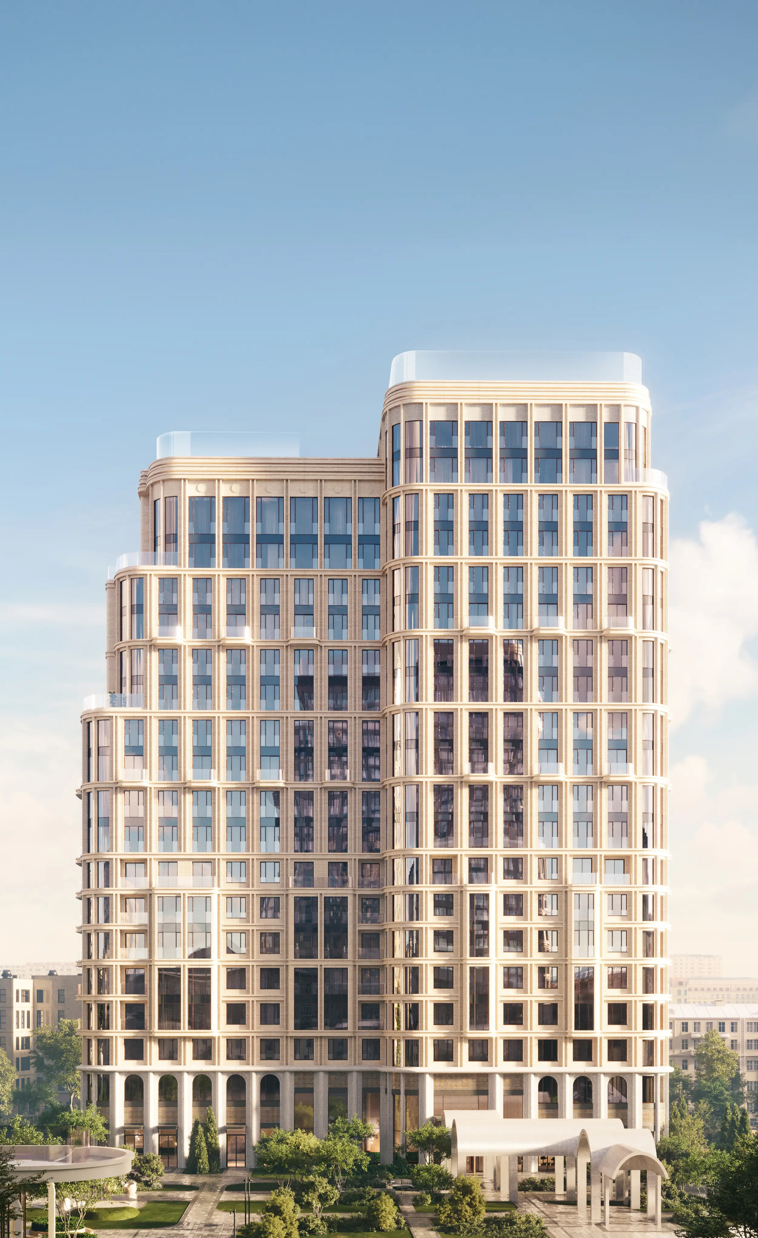 Благородная пластика и эксклюзивный декор фасадов, большие площади остекления — каждая деталь говорит о тонком вкусе и уважении к традициям.
